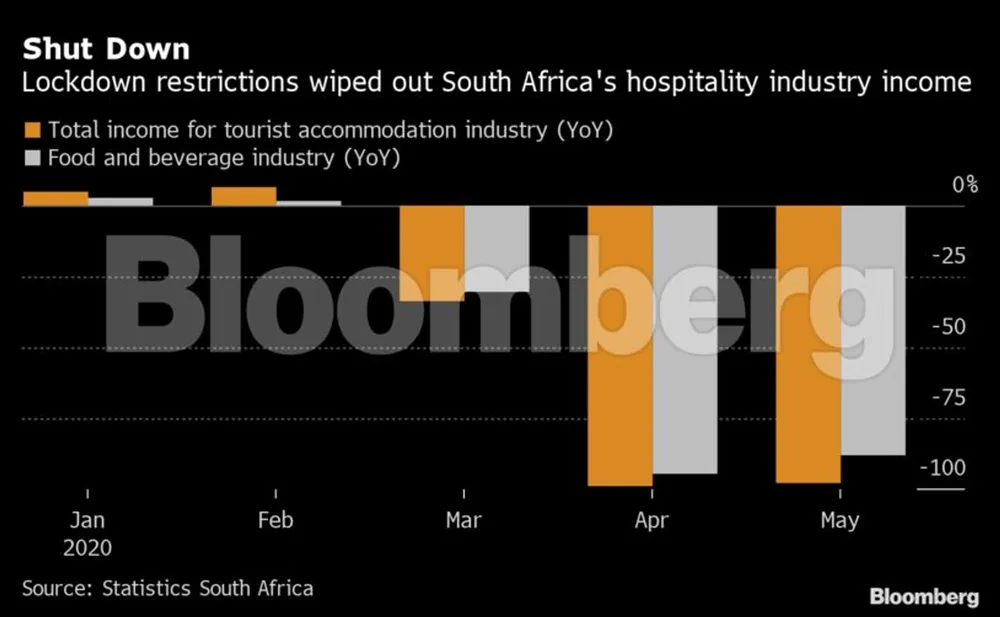 In South Africa, the impact of restrictions on the movement of people and business, also showed up in domestic-tourism numbers. Income from accommodation fell 99% during the first full month of the lockdown, and has yet to recover. The crash in food-and-beverage sales eased slightly in May as restaurants opened for delivery, but a renewed ban on the sale of alcohol could further weigh on the industry. Travel for leisure is still only allowed within provinces, which means seaside holidays and most game resorts are off limits to people in Gauteng, the richest and most populous province.