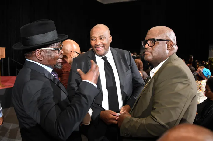 Finance Minister Enoch Godongwana, left; Sport, Arts and Culture Minister Gayton McKenzie; and Land Reform and Rural Development Minister and PAC leader, Mzwanele Nyhontso during the swearing-in ceremony of the new Cabinet ministers at the Cape Town International Convention Centre. GICS
