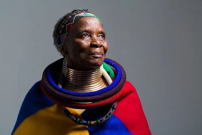 Lena Dasi poses in a Ndebele outfit during a photoshoot on her 82nd birthday. Photographer: Jonathan Caramanus Lena Dasi poses in a Ndebele outfit during a photoshoot on her 82nd birthday. Photographer: Jonathan Caramanus