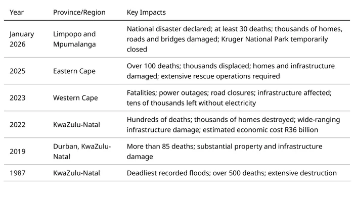 A history of flooding and resultant damages in South Africa.
