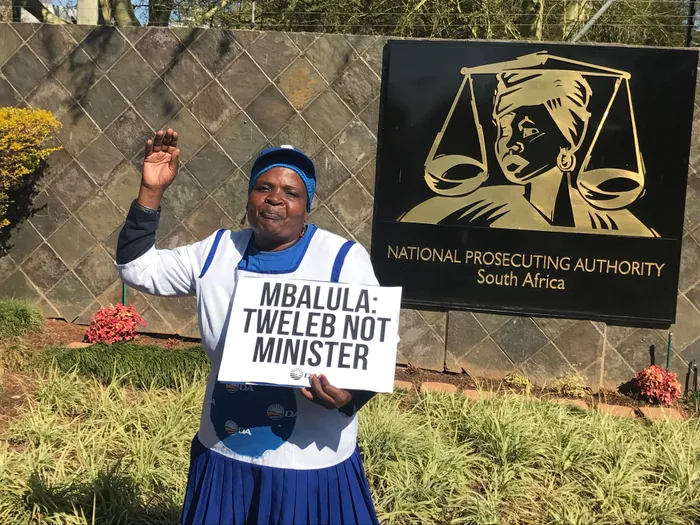 Some of the DA protesters at the NPA offices waved placards saying “Mbalula: Tweleb not minister”, “NPA is captured”, and “Covering up for Zupta?”.