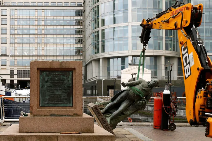 A statue of Robert Milligan, an 18th century slave trader, is removed by workers outside the Museum of London Docklands in the UK. Picture: Reuters A statue of Robert Milligan, an 18th century slave trader, is removed by workers outside the Museum of London Docklands in the UK. Picture: Reuters