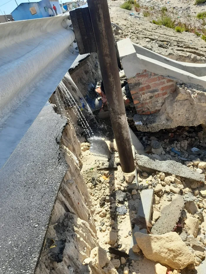 According to Quintas, the cause of parts of the roads to wash away was a combination of windblown sand and solids in the sewerage that blocked the inlet and discharge pipe causing the sewerage to overtop the kerb and run down the embankment.