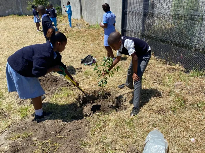 Bongolethu Primary pupils plant water pear trees in the school yard. Picture: Zintle Mdaka