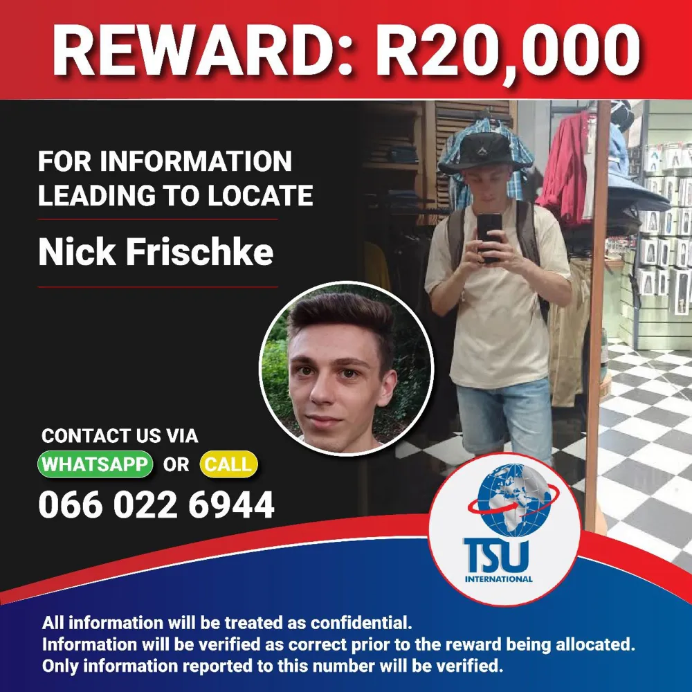 Cape Town – The family of missing German tourist, Nick Frischke, has offered a R20 000 reward to anyone with information on his whereabouts.