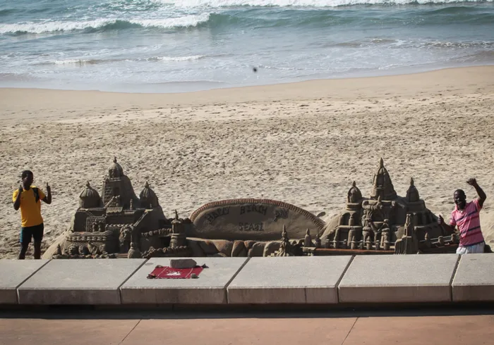 Durban beachfront sculptors Sibusiso Magubane, left, and Mzwakhe Mdletshe let their imaginations run riot with this sprawling, African-themed sandcastle. For a few rands, the sculptors will add a birthday greeting. Picture: Motshwari Mofokeng