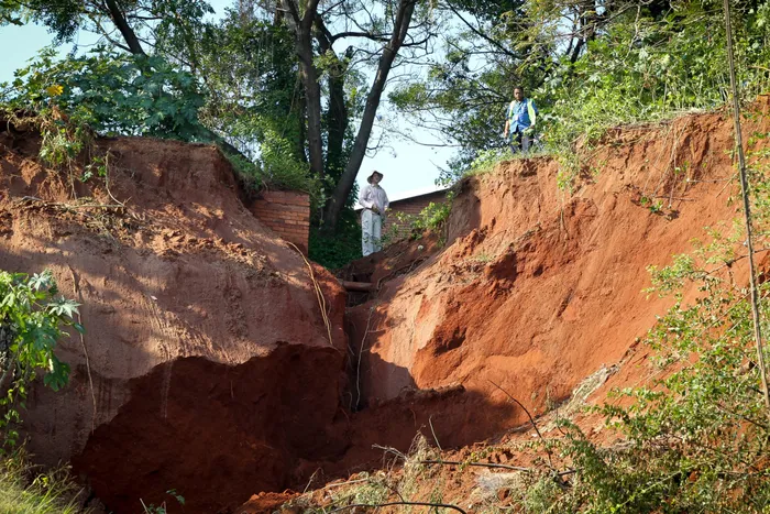 John Clarkson, a land surveyor, left, and Omesh Ori, of the eThekwini Municipality's engineering department, stand on an embankment that collapsed on to a railway line on the Bluff after the recent heavy rains. Picture: Motshwari Mofokeng