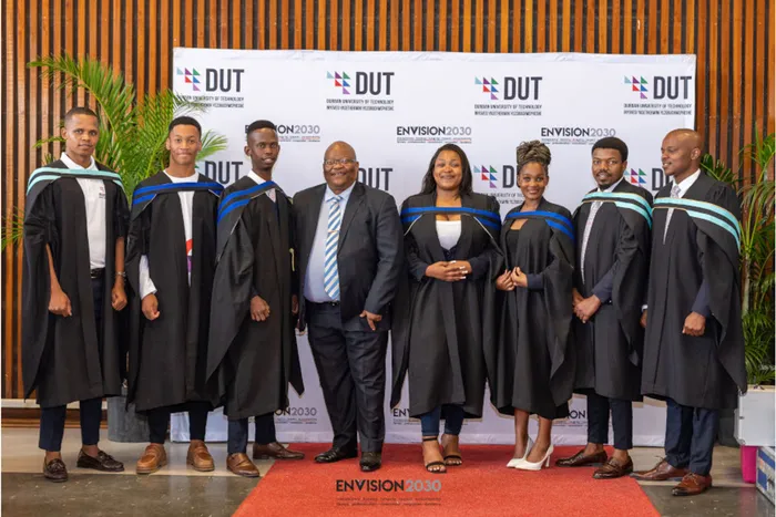 Four SRC members from the Midlands campuses have graduated and three from Durban will graduate next week. From left: Organisation and accommodation officer in Durban, Sibusiso Mbhele, treasurer-general, Asanda Mngomezulu, secretary-general, Ntokozo Joyful Gcabashe, DUT Registrar, Dr Maditsane Nkonoane, deputy president, Thandolwethu April, projects officer in Durban, Nonhle Dlamini, education and transformation officer in Midlands, Gideon Mthembu and organisation and accommodation officer in Midlands, Njabulo Nkomonde. Picture: Khulasande Tshayile. Four SRC members from the Midlands campuses have graduated and three from Durban will graduate next week. From left: Organisation and accommodation officer in Durban, Sibusiso Mbhele, treasurer-general, Asanda Mngomezulu, secretary-general, Ntokozo Joyful Gcabashe, DUT Registrar, Dr Maditsane Nkonoane, deputy president, Thandolwethu April, projects officer in Durban, Nonhle Dlamini, education and transformation officer in Midlands, Gideon Mthembu and organisation and accommodation officer in Midlands, Njabulo Nkomonde. Picture: Khulasande Tshayile.
