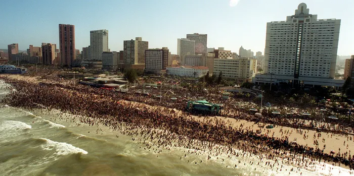 An aerial view of Durban’s South Beach shows thousands of people swimming, but the beach is one of the closed beaches because of high E. coli levels. Picture: Archives