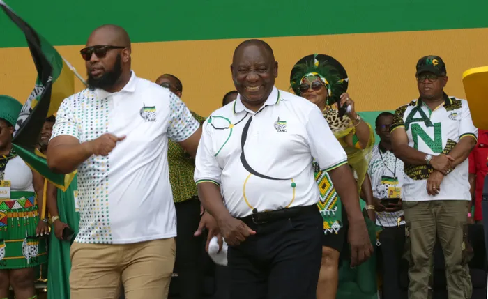 President Cyril Ramaphosa, right, dancing with KZN ANC chairperson Siboniso Duma during the ANC Mayihlome Rally manifesto launch at the Moses Mabhida Stadium. | KHAYA NGWENYA/ Independent Newspapers