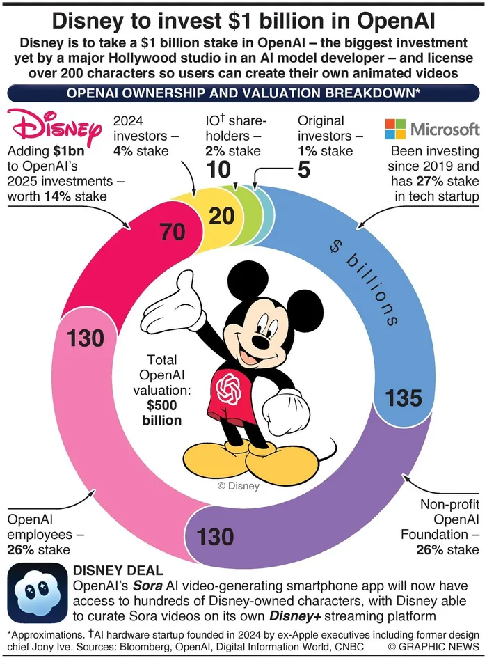 Disney is to take a $1 billion stake in OpenAI and has agreed to license its iconic animated characters, including Mickey Mouse, to OpenAI so that users can create their own Disney animated videos.