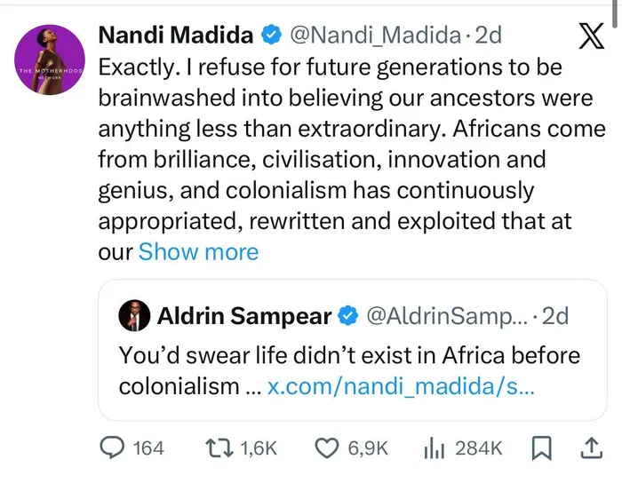 Madida replied, “Exactly. I refuse for future generations to be brainwashed into believing our ancestors were anything less than extraordinary. Africans come from brilliance, civilisation, innovation, and genius, and colonialism has continuously appropriated, rewritten, and exploited that at our expense.