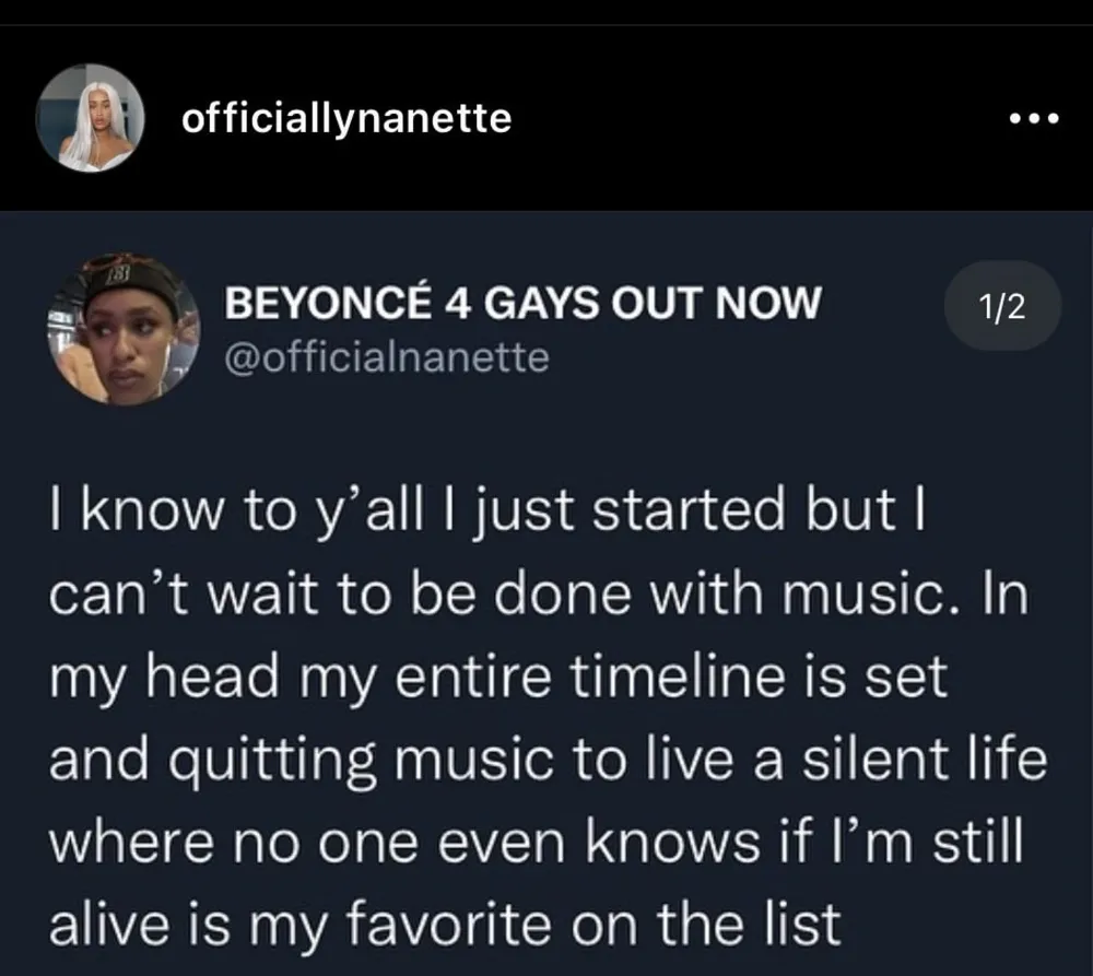 “I know to y’all I just started but I can’t wait to be done with music,” she posted on her Twitter account