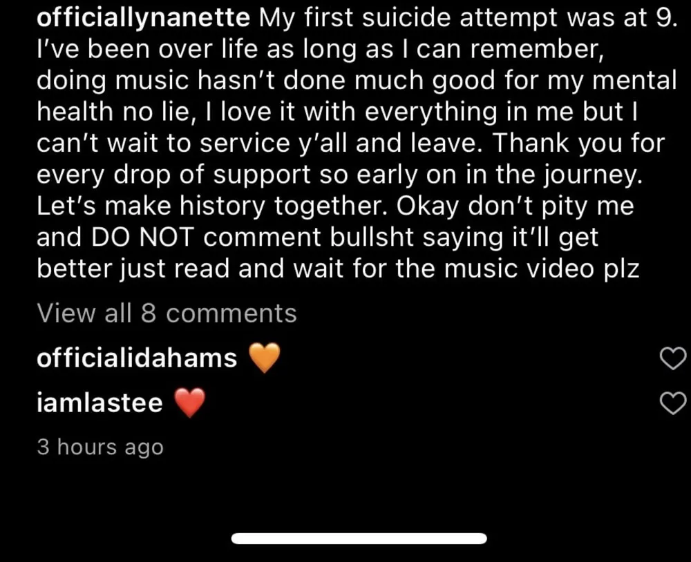 In a now deleted Instagram post, she took a screen shot of the tweet and wrote a lengthy caption: “My first suicide attempt was at 9. I've been over life as long as I can remember, doing music hasn't done much good for my mental health no lie, I love it with everything in me but I can't wait to service y'all and leave.