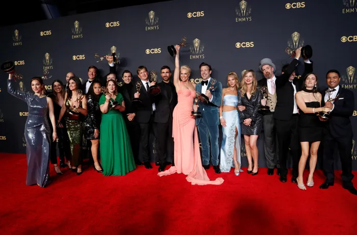 The cast and crew members of comedy series ’Ted Lasso’ pose for a picture with their awards at the 73rd Primetime Emmy Awards in Los Angeles, U.S., September 19, 2021. Picture: Reuters/Mario Anzuoni