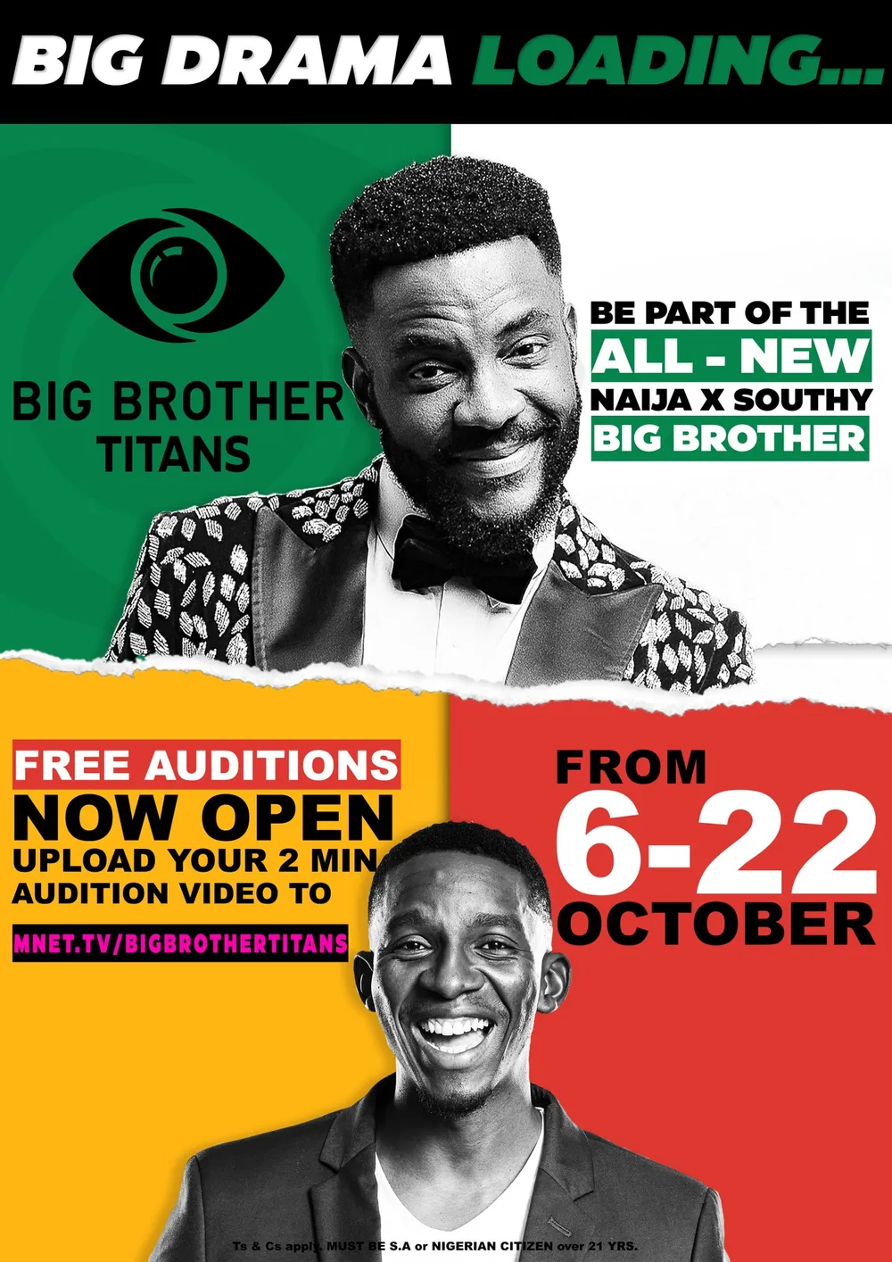 “Big Brother Titans” entrants must be 21 years old by the end of October, and they must be a South African or Nigerian citizen or a permanent resident of either country.