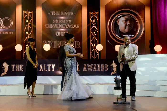Winnie Ntshaba presented Presley Chweneyagae with the Outstanding Lead Actor award for his role as Cobra in ’The River’. Picture: Supplied