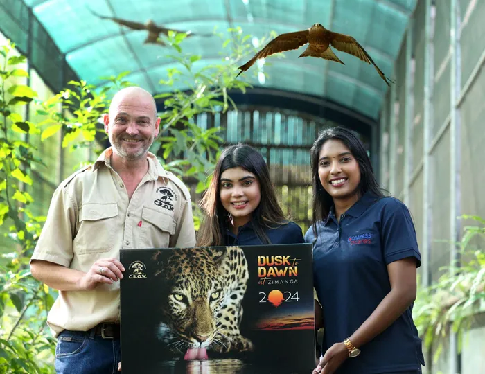 Yellow-billed kites fly over, from left, the Centre for Rehabilitation of Wildlife (Crow) operations director Clint Halkett-Siddall, Shanice Ramasami and Liverna Naicker of Compass Waste Medical Services in the birds' rehabilitation enclosure. They were unveiling the 2024 Dawn to Dusk Crow Calendar produced in partnership with Compass Cares (Compass’s CSI division) as part of the organisation's efforts to raise funds. Picture: Shelley Kjonstad African News Agency ANA
