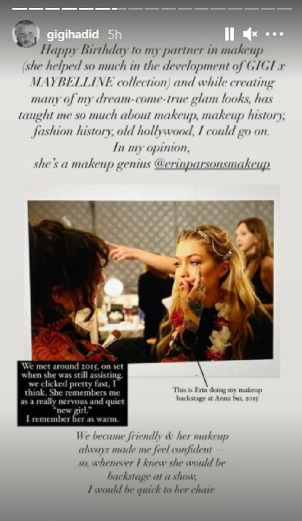 She wrote alongside a snap of Erin doing her glam in 2015 at Anna Sui: "Happy Birthday to my partner in makeup (she helped so much in the development of GIGI x MAYBELLINE collection) and while creating many of my dream-come-true glam looks, has taught me so much about makeup, makeup history, fashion history, old hollywood, I could go on.