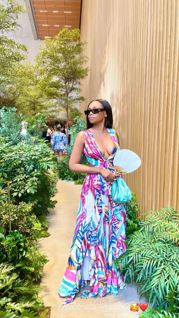 At the PatBo show that took place at the Le Pavillon, Matheba donned a colourful summer dress by a designer. PatBo is a Brazilian brand founded on the art of embroidery and original prints.
