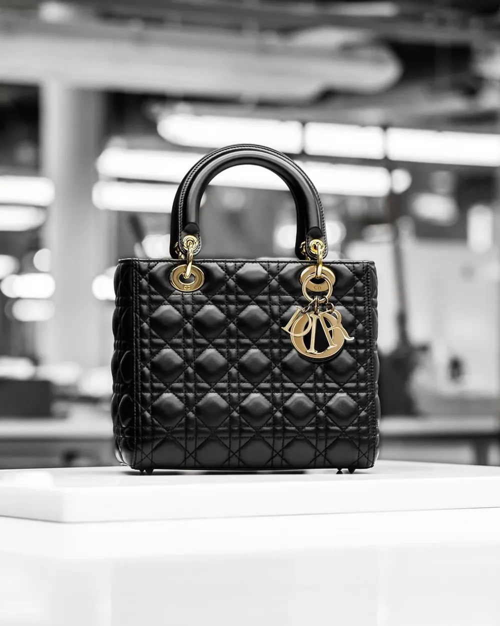 A medium-sized, black lambskin Lady Dior handbag enhanced with Dior’s iconic ‘Cannage’ stitching is currently valued at R100k.