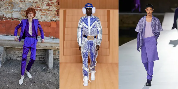 Very Peri garments from Saint Laurent, Louis Vuitton and Valentino. PICTURES: Vogue.com/Collage via Fotor