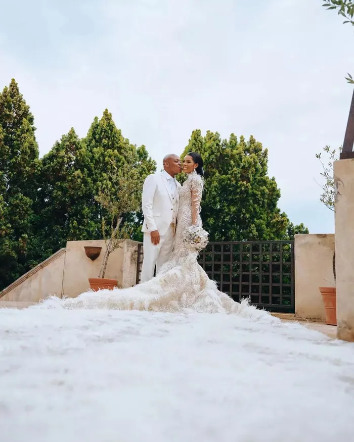 Harriet donned a beautiful wedding gown with a dramatic train by Biji - La Maison, the designer responsible for Zozibini Tunzi’s dress when she won Miss Universe 2019.