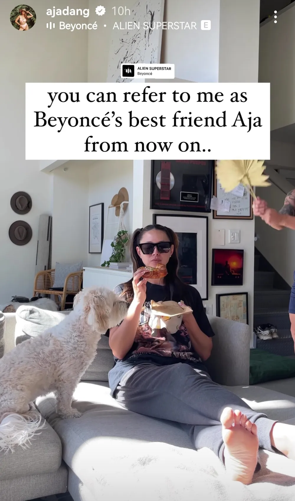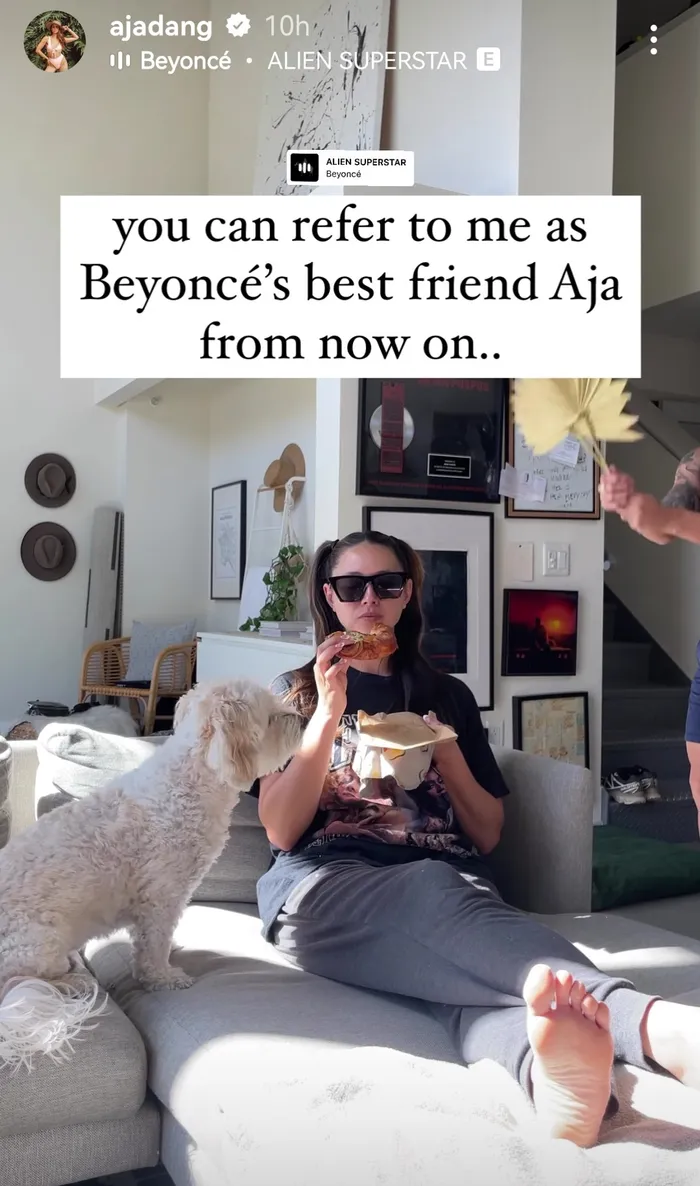 On Instagram, she posted an Insta story of herself sitting on a daybed being fanned down like a queen with the caption, “You can refer to me as Beyonce’s friend Aja from now on...”