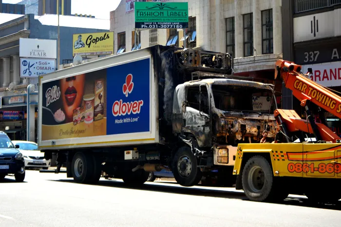 Clover said that investigations were being carried out after one of its trucks was set alight yesterday in the Durban city centre. The cab of a Clover truck was burnt in the Durban CBD yesterday. Picture: Theo Jeptha/ African News Agency(ANA)