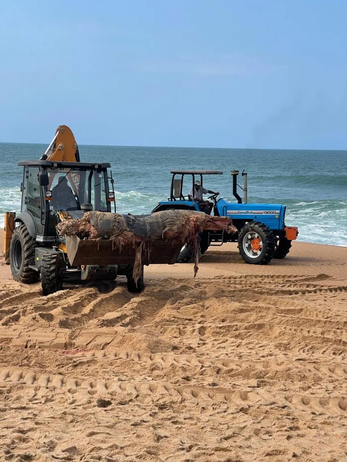 Photograph of a whale carcass being carried off the beach in a front loader. A whale carcass is removed from a KwaDukuza beach after washing ashore at Salmon Bay on Tuesday. Picture: Supplied