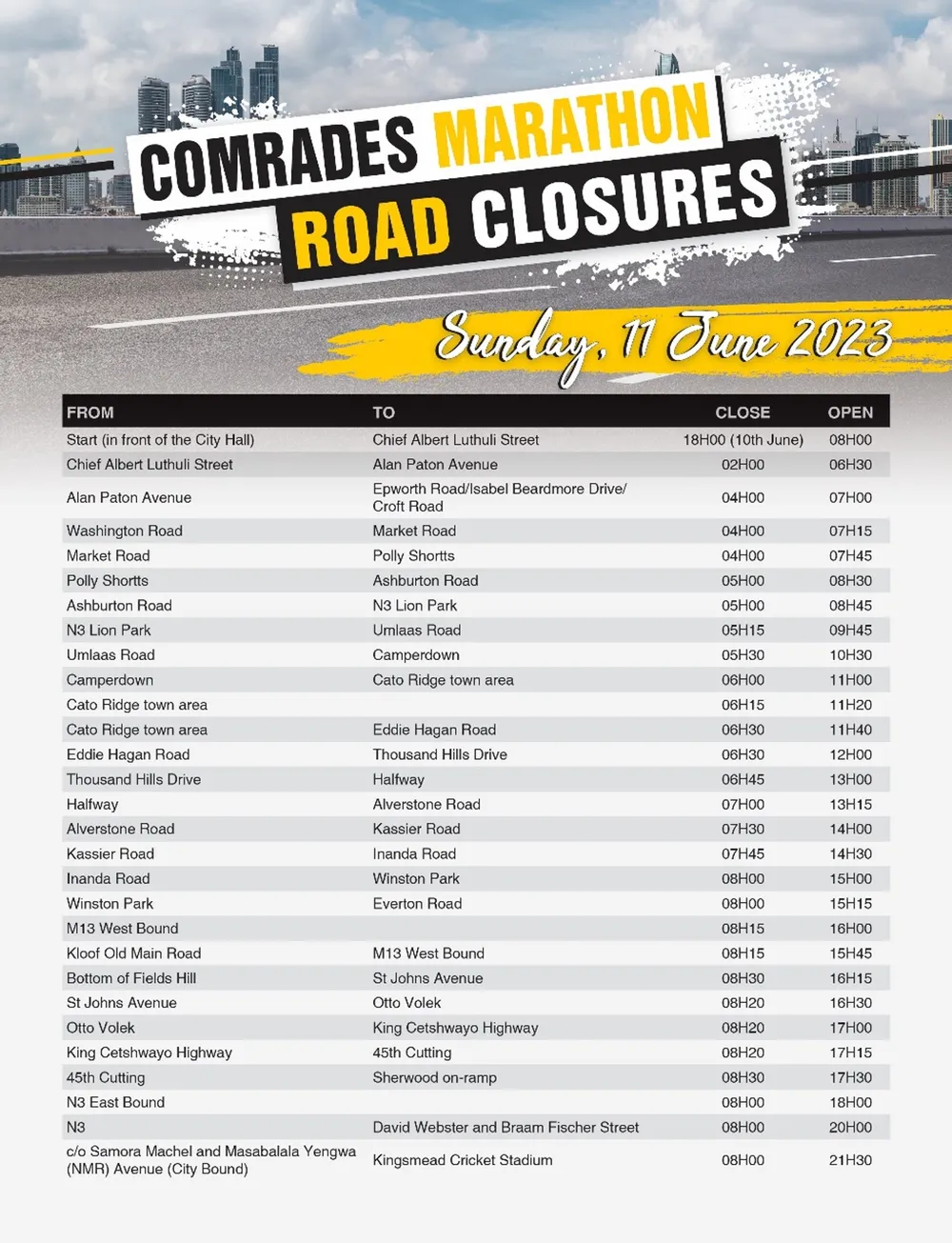 “The Comrades Marathon Association (CMA) has confirmed the following road closures and alert notification which will be effective over Comrades race weekend, starting around midnight on Saturday 10th until 21h30 on Sunday, 11th June 2023.”