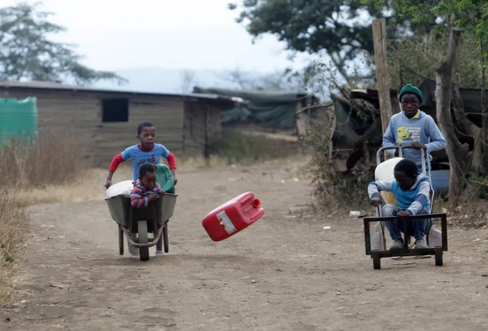 A drum falls off a wheelbarrow next to a trolley being pushed by children going to fetch water. Children on their way to fetch water from a borehole in Gonokwakhe outside Pietermaritzburg. File Picture: Bongani Mbatha/African News Agency(ANA)