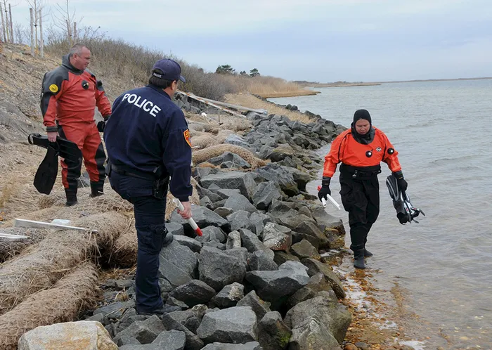 Police divers take measurements for a search grid at Hemlock Cove on Long Island. Police divers take measurements for a search grid at Hemlock Cove on Long Island.