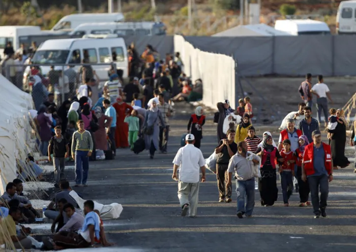 Newly arrived Syrian refugees walk to their tents in the Turkish border town of Reyhanli, as others who are already placed rest in front of their shelters. Newly arrived Syrian refugees walk to their tents in the Turkish border town of Reyhanli, as others who are already placed rest in front of their shelters.