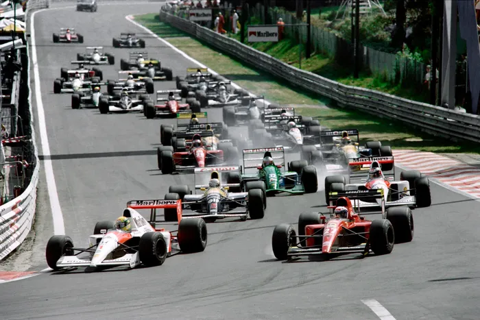 Ayrton Senna 1991 Ayrton Senna leads the pack at the Source hairpin bend on August 25, 1991 just after the start of the Belgian Grand Prix. Picture: AFP.