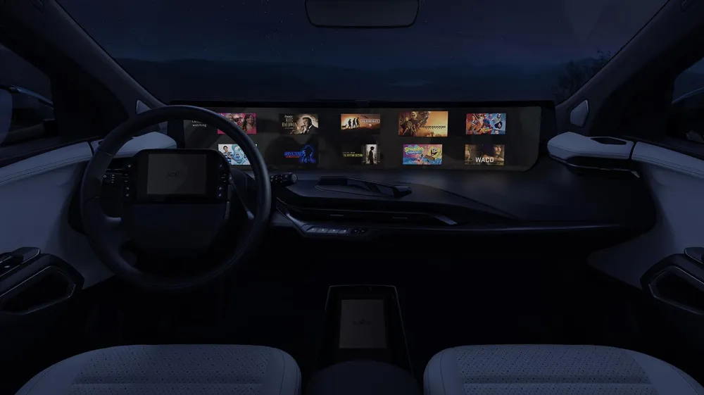 When parked, the car can be an office, enabling video conference calls, or a roadside cinema.