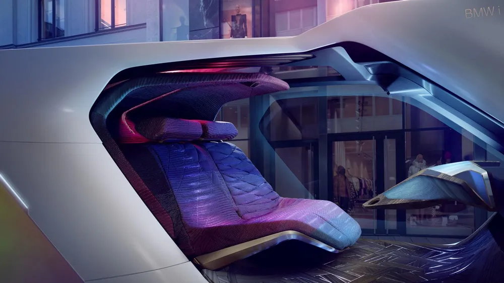 BMW showed at its CES display a concept of its future interior with reclining lounge chairs and a windshield with augmented reality built in to annotate the road ahead.