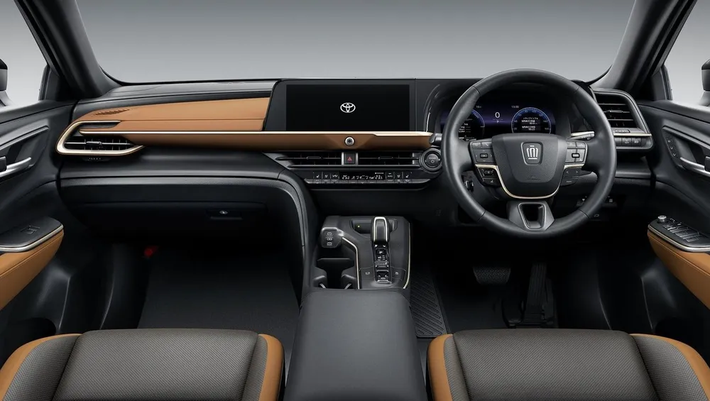 Inside, Toyota has horizontally integrated the display and operating equipment to create a functional layout to be operated from any seat. A wrap-around form from the instrument panel to the doors has been used and this gives a sense that all seats in the Crown are special, thus allowing the driver to retain their focus on driving and providing “comfortable and enjoyable” mobility for passengers.