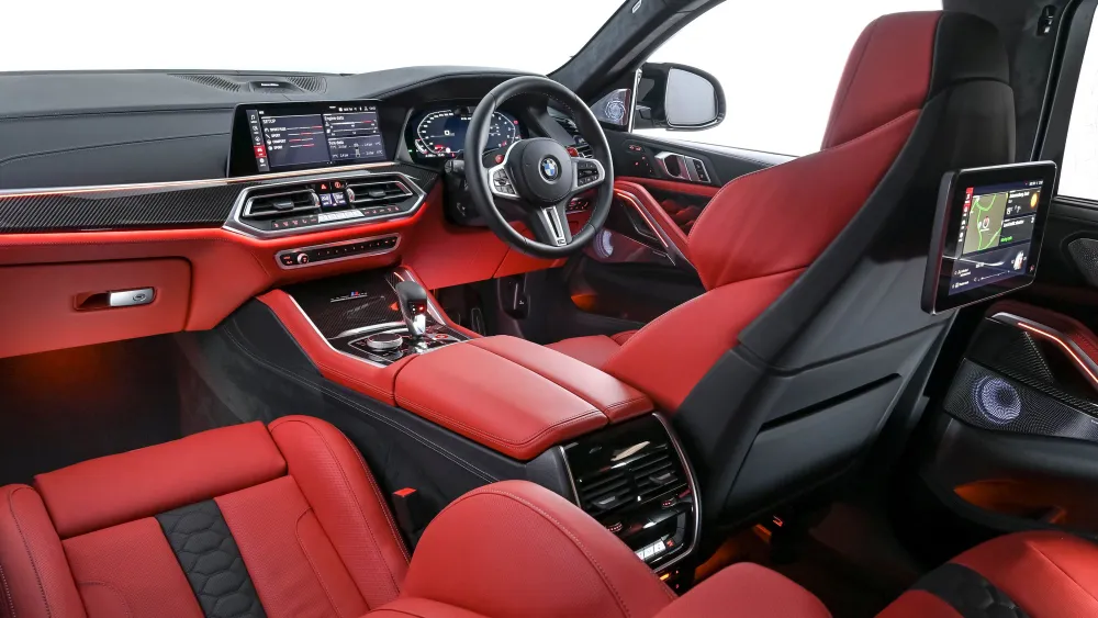 Large air intakes, the signature BMW kidney grille with double bars, M gills on the front side panels, a rear spoiler, rear apron with diffuser elements and an exhaust system with two sets of twin tailpipes complete the design. Both stand impressively on 21-inch alloys in front and 22-inch at the rear.