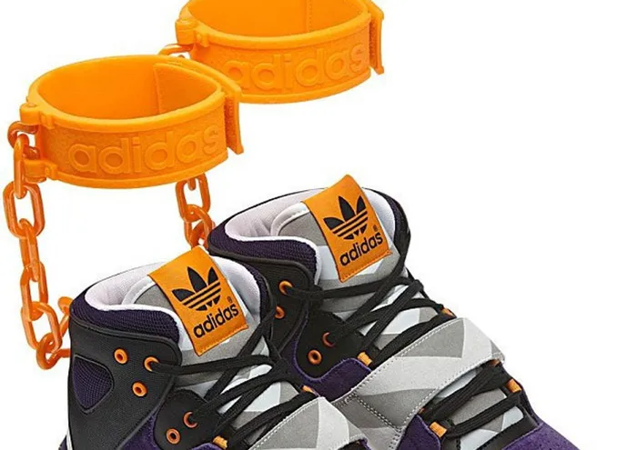 DAYS OF SLAVERY: Adidas's new trainer offering, the JS Roundhouse Mids, has raised a furore with its "slavewear" shackles. DAYS OF SLAVERY: Adidas's new trainer offering, the JS Roundhouse Mids, has raised a furore with its "slavewear" shackles.