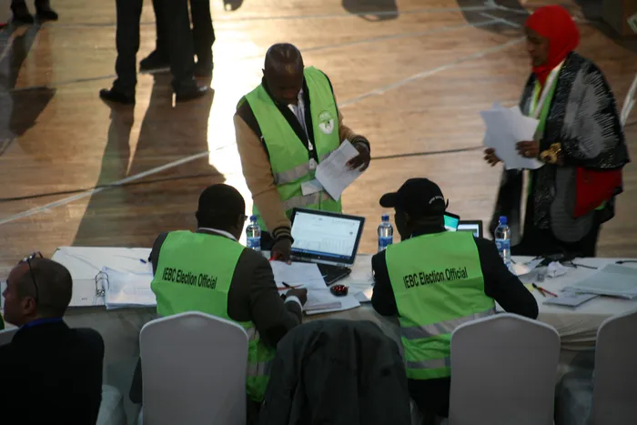 Officials of the Independent Electoral and Boundaries Commission (IEBC) work at the tallying center in Nairobi, Kenya, before the formal announcement of the winner. Picture: Xinhua/Charles Onyango Officials of the Independent Electoral and Boundaries Commission (IEBC) work at the tallying center in Nairobi, Kenya, before the formal announcement of the winner. Picture: Xinhua/Charles Onyango