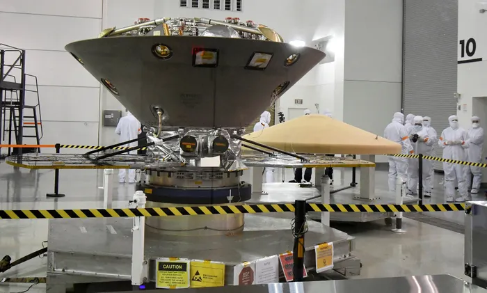 NASA's InSight spacecraft, destined for the Elysium Planitia region located in Mars' northern hemisphere, undergoes final preparations at Vandenberg Air Force Base. Picture: Reuters/Gene Blevins/File Photo NASA's InSight spacecraft, destined for the Elysium Planitia region located in Mars' northern hemisphere, undergoes final preparations at Vandenberg Air Force Base. Picture: Reuters/Gene Blevins/File Photo