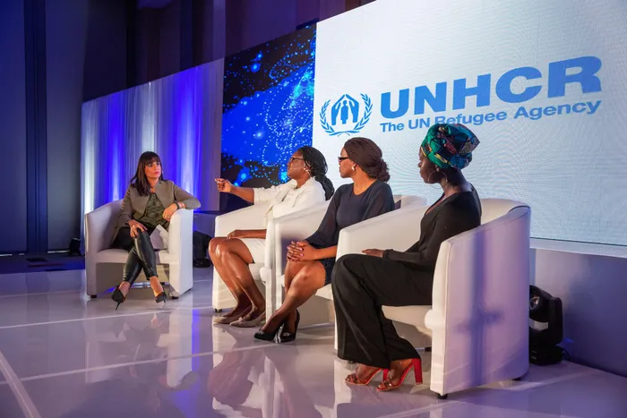 Leanne Manas, UNHCR Goodwill Ambassador moderates a panel with Needa Jehu-Hoyah, Head of UNHCR Private Sector Partnerships, Mandisa Mathobela, Head of Stakeholder Relations at Old Mutual, and Sarah, a refugee university student living in South Africa. Picture: Supplied Leanne Manas, UNHCR Goodwill Ambassador moderates a panel with Needa Jehu-Hoyah, Head of UNHCR Private Sector Partnerships, Mandisa Mathobela, Head of Stakeholder Relations at Old Mutual, and Sarah, a refugee university student living in South Africa. Picture: Supplied