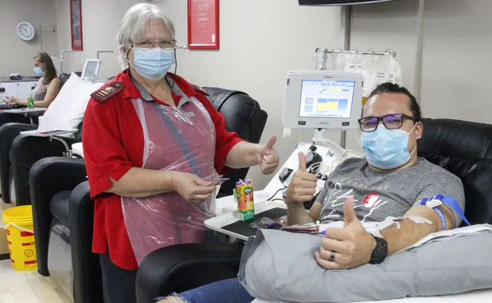 South Africa - Pretoria - 6 January 2022 - Stephan Taljaard donoting blood for the 28th time with donar care officer Hettie van der Vyver . Picture: Jacques Naude/African News Agency(ANA)