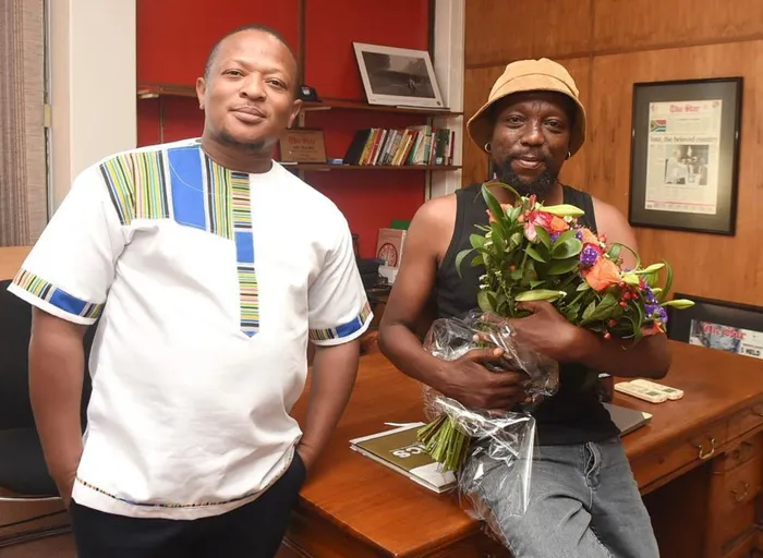 The Star newspaper’s Sifiso Mahlangu with Bonginkosi Dlamini, better known as Zola 7, who had an interview with The Star reporters at the headquarters of independent media on Wednesday. Picture: Itumeleng English/African News Agency(ANA)