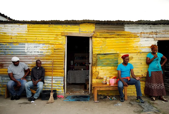 Members of a mining community sit outside a shack in Nkaneng township, Marikana's informal settlement, in Rustenburg, South Africa, April 1, 2014. REUTERS/Siphiwe Sibeko/File Photo
