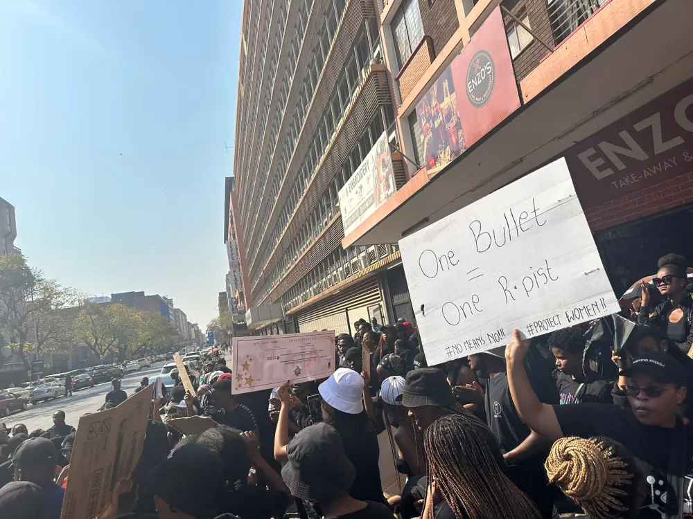 Clad in black regalia, students in their numbers gathered outside the courthouse with placards reading: “One Bullet, One rapist”, and “No means no”.