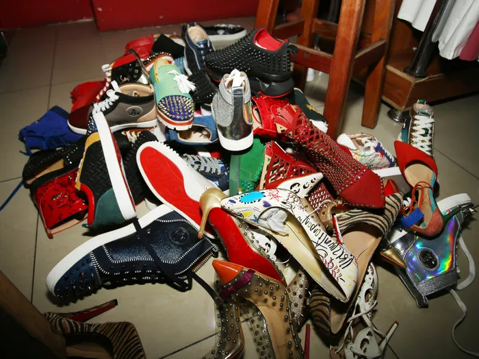 KZN Provincial Commissioner Lieutenant General Khombinkosi Jula inspects a counterfeit designer brand shoe, inset right, during a police raid on clothing shop near Durban’s beachfront yesterday. Sibusiso Ndlovu