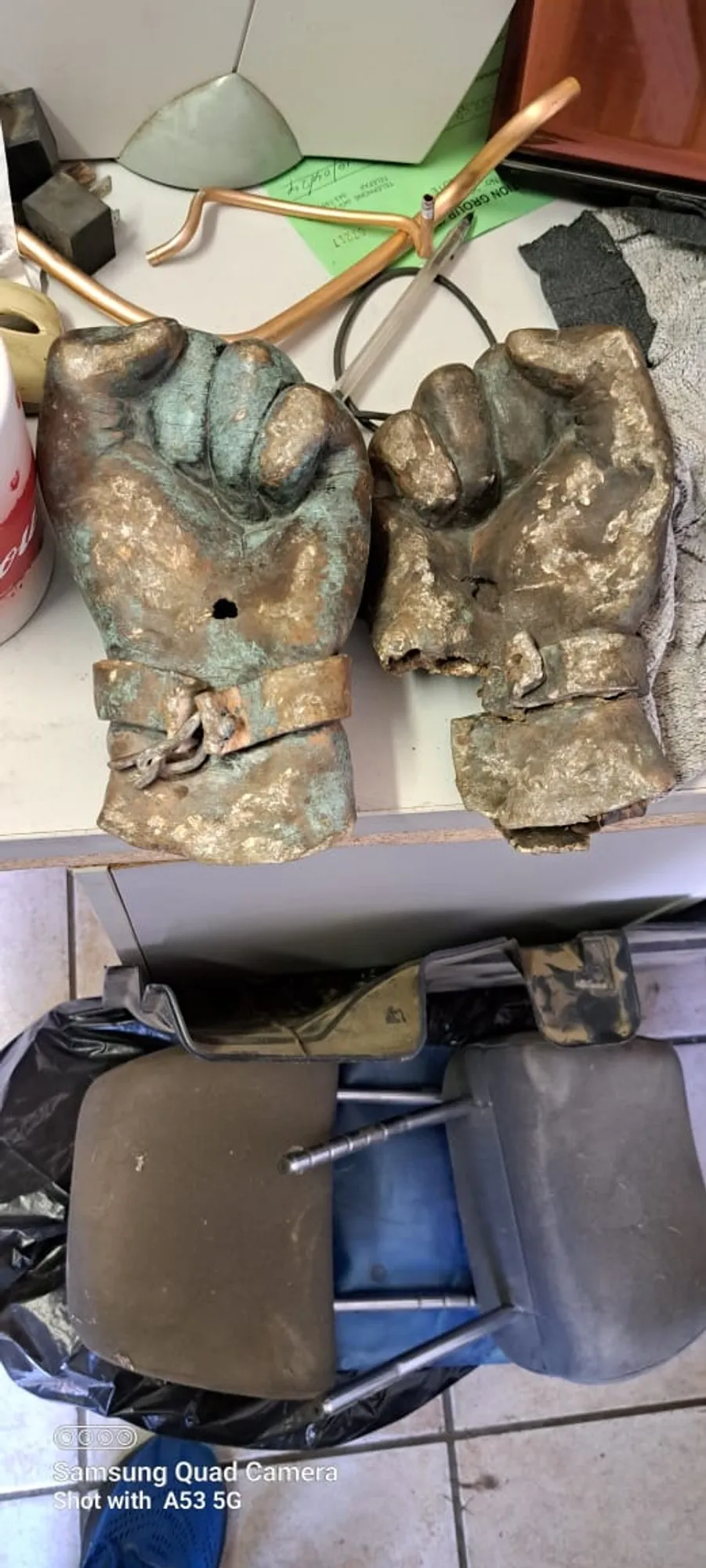 The culprit was later caught when he went to collect money he was owed by the scrap metal business he had sold the iconic hands symbolising Bikos’ shackles.