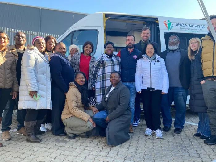 Dis-Chem CEO Rui Morais, Lynette Saltzman, Rhiza Babuyile founder Alef Meulenberg and mobile clinic beneficiaries. | Supplied